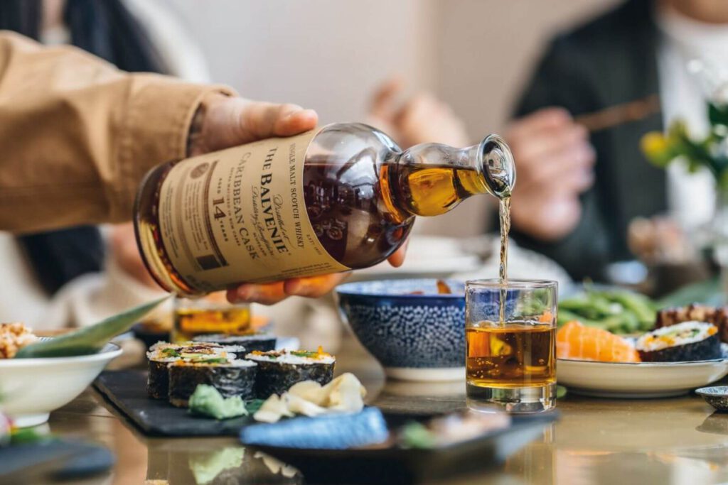 So wie bei Sushi eingelegter Ingwer verwendet wird, um den Gaumen für das nächste Stück zu reinigen, sollte man während der Verkostung und speziell zwischen den individuellen Whiskys genug Wasser trinken.