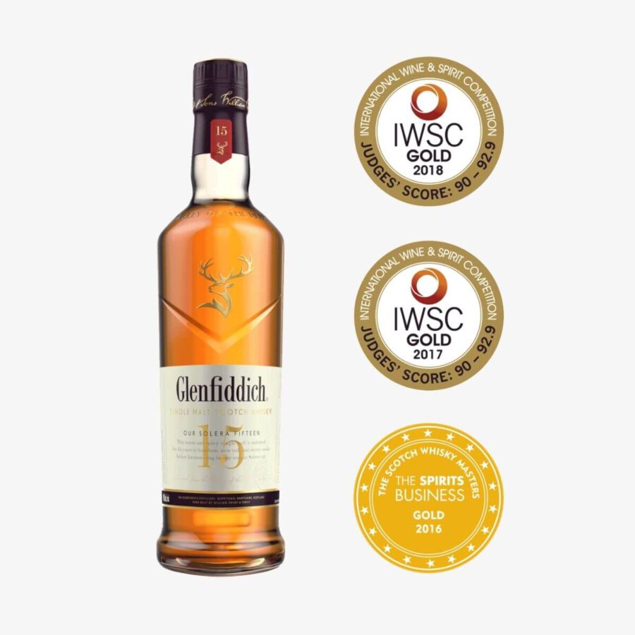 Glenfiddich 15: Die Besonderheit des Glenfiddich Solera Reserve ist ein spezielles Solera Eichenfass, das verwendet wird, um ausgewählte Fässer (Sherry, Bourbon und frische Eiche), in denen der Whisky 15 Jahre oder länger geschlummert hat, zu vermählen.